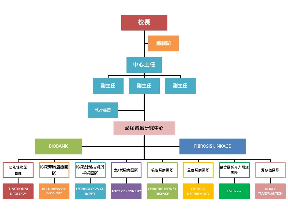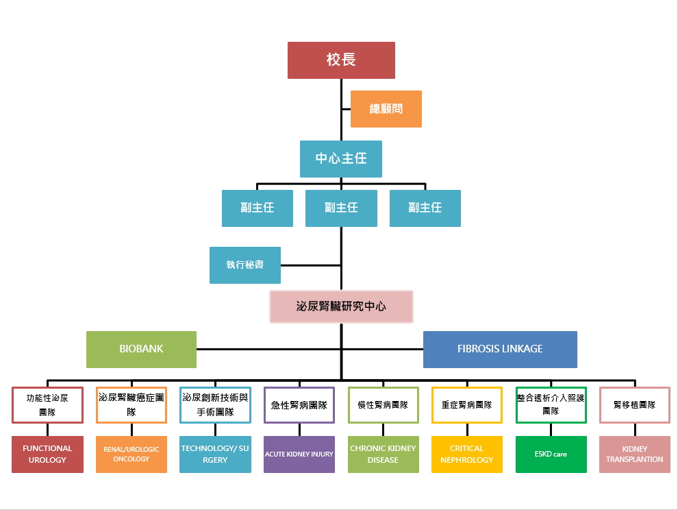 長期以來,泌尿與腎臟雖然分屬外科與內科領域,但兩科所照顧之器官疾病與研究範圍多所重疊,現今醫學也逐漸強調跨領域之價值與重要性,加上目前三家附屬醫院之泌尿與腎臟科發展至今已逐漸成熟,若能整合三院之人力專長與資源,必能創造一加一大於二之效果,開拓新研究領域並提升研究質量、且創造醫療特色。藉由校級研究中心之規範與創立,期能達到如美國克里夫蘭醫學中心泌尿腎臟聯合機構成為全美兩學門數一數二之中心。.